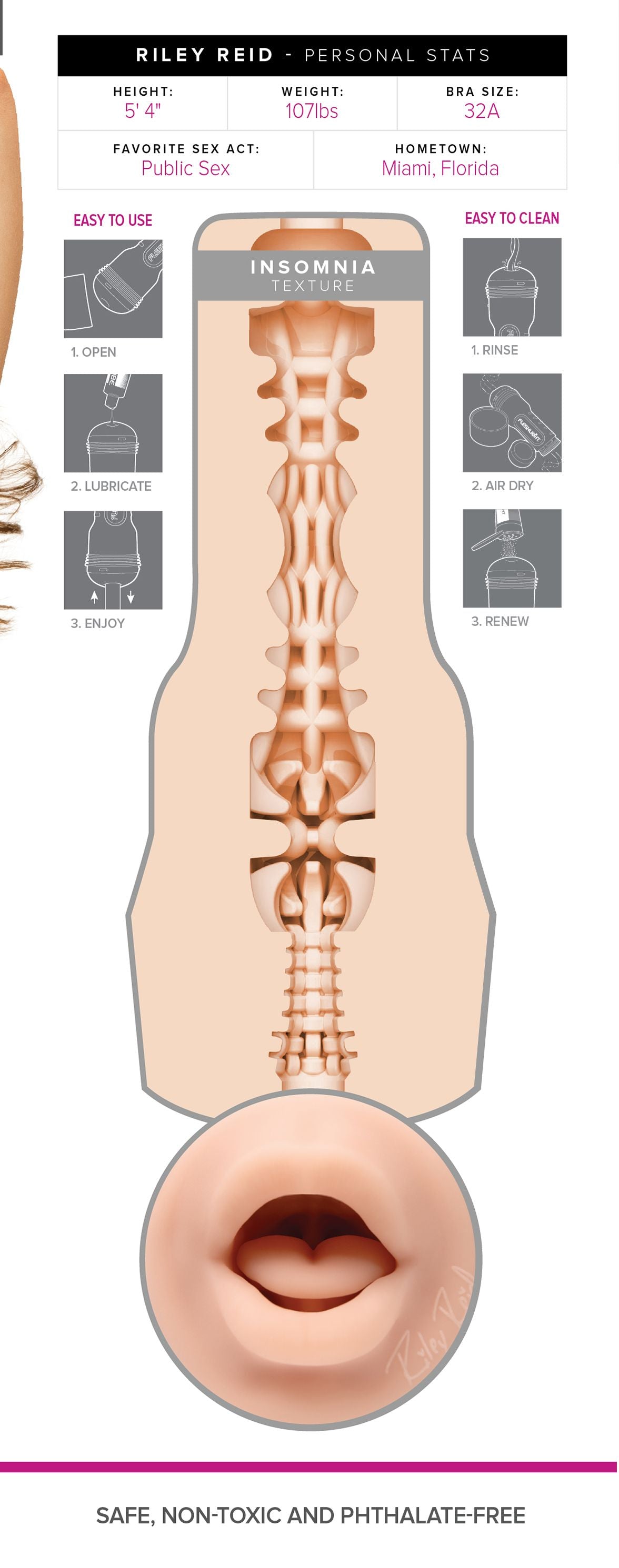 Erlebe deine aufregendsten oralen Fantasien mit der Riley Reid Insomnia Signature - Mund. Dieses exklusive Fleshlight-Modell bringt Rileys seidig-weiche Lippen zum Leben und bietet ein unglaublich realistisches und intensives Vergnügen.